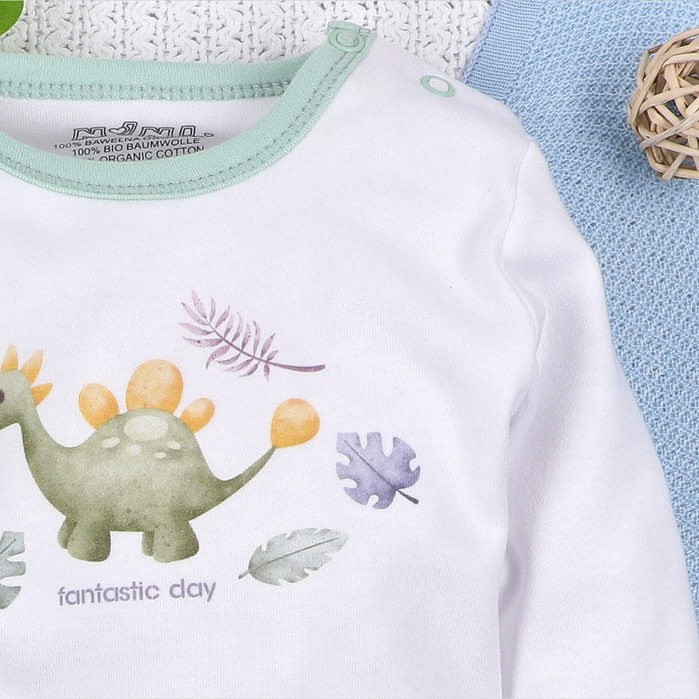 • Nini baba bodysuit Dino Explorer - 100% organikus pamut, hosszú ujjú, kényelmes nyomógombos rögzítéssel.