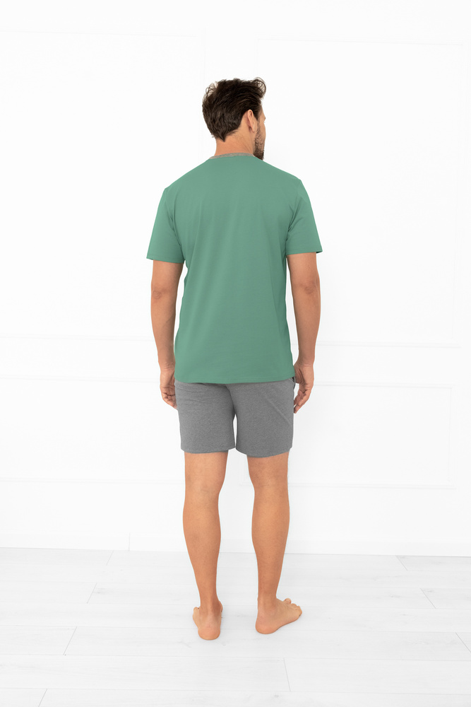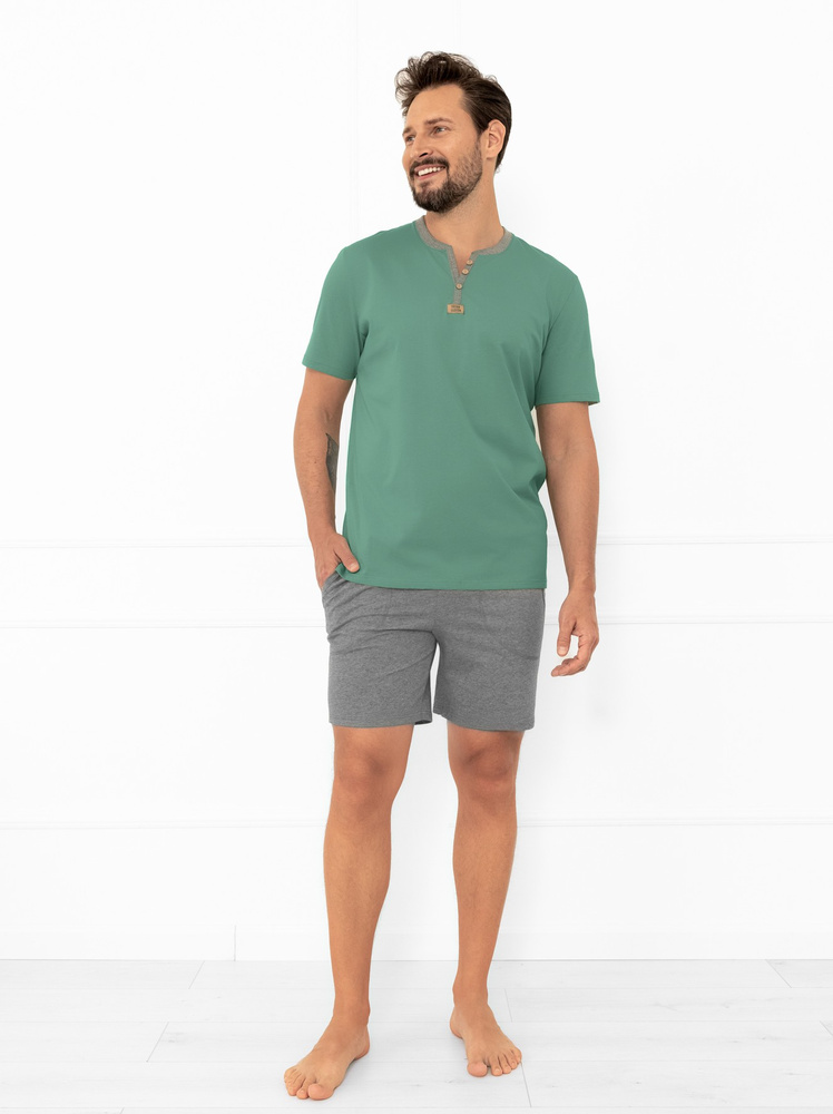 • Rövidebb férfi pizsama Julius by Italian Fashion - V-nyakú póló gombokkal, rövidnadrág zsebekkel.