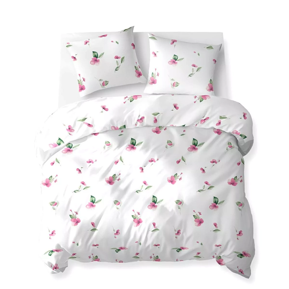 5769 A Detexpol Cotton Bloom ágynemű fehér, rózsaszín virágokkal, zöld levelekkel - 100% pamut, kétoldalas, polírozott, kétoldalas, polírozott