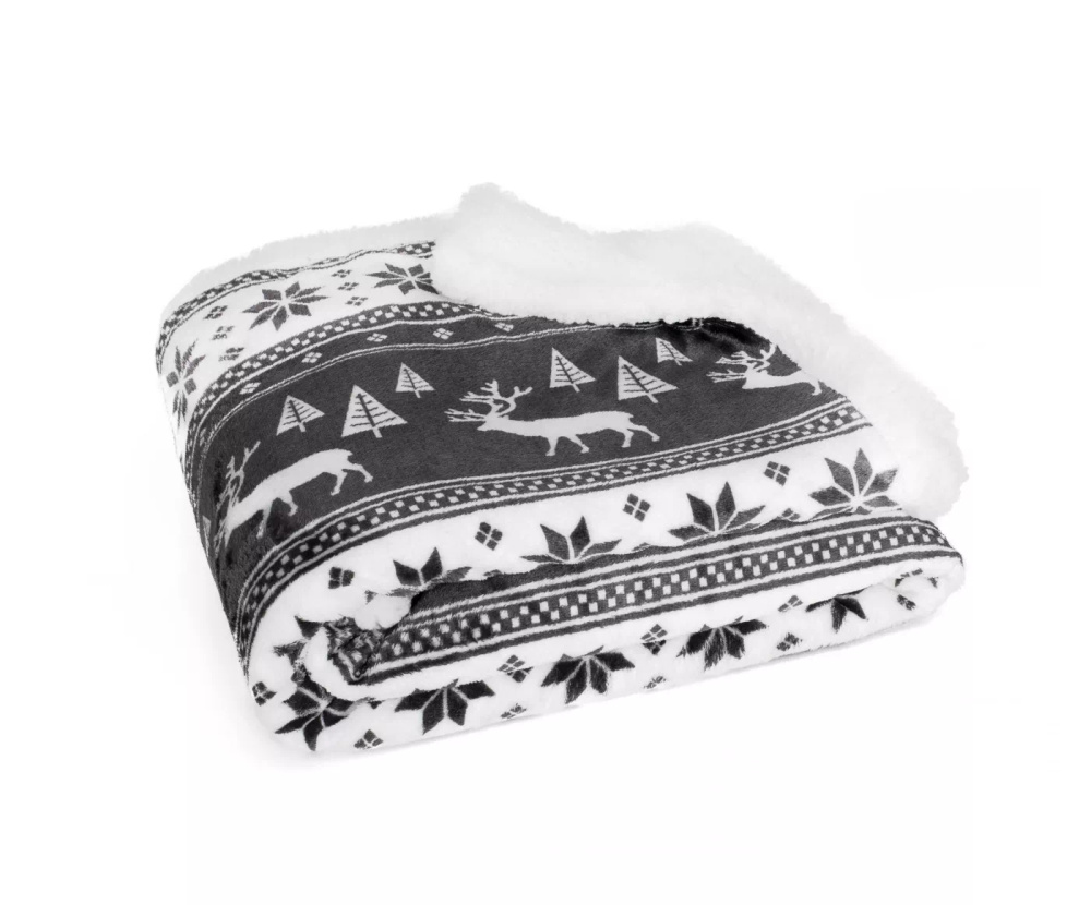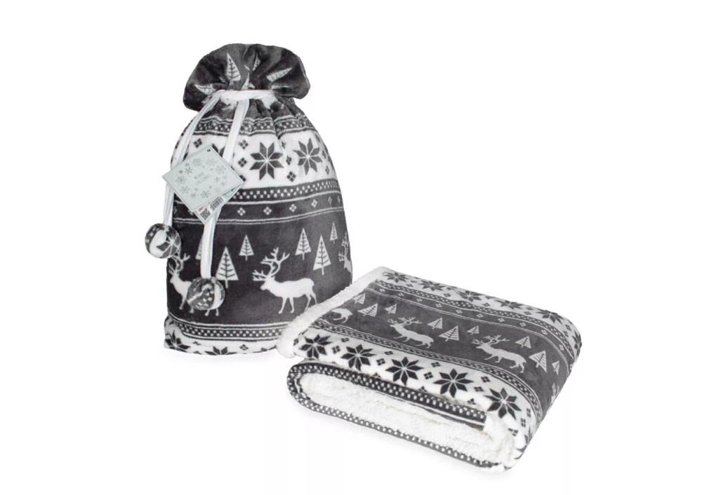 • SACO puha karácsonyi takaró rénszarvas és karácsonyfa motívumokkal. Meleg, kényelmes és díszes zacskóba csomagolva - tökéletes ajándéknak.