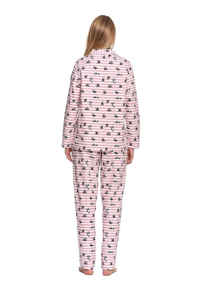 • Moraj pizsama PDD6300-002. Puha pamut flanel, csíkos minta pandákkal, gombos ing és nadrág zsebekkel.