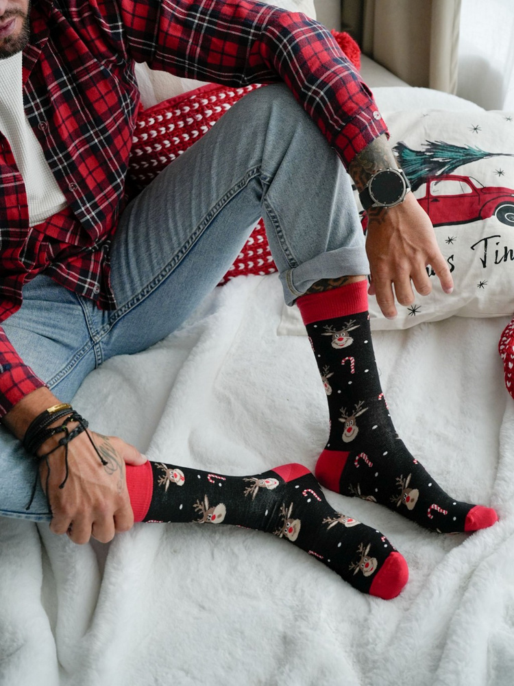A modellt színes, ünnepi rénszarvas motívum díszíti, amely vidám, téli hangulatot teremt. A zoknik tökéletesek mindennapi használatra, de karácsonyi ajándékként is - praktikus és humoros.