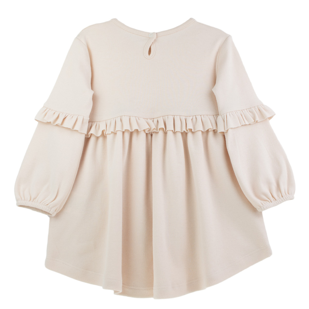 - Lányok bézs színű, hosszú ujjú Nicol ruhája, 100 % tanúsított pamutból készült. Fodrokkal díszített és praktikus könnycseppes záródással ellátott.