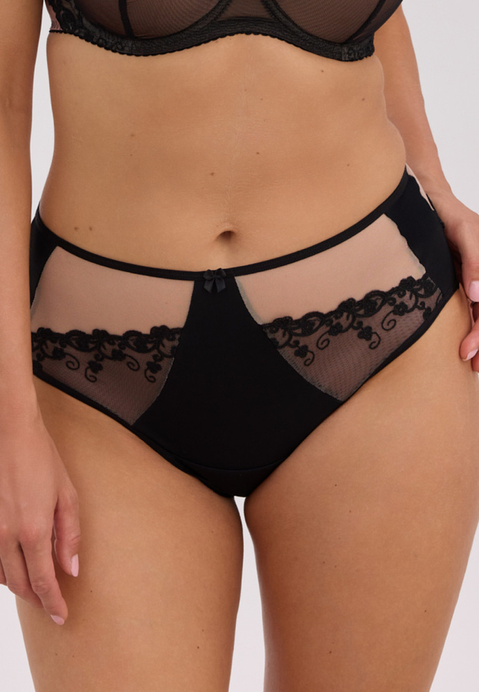 Gondosan megtervezett klasszikus vágott teljes füge gyönyörűen alkalmazkodik a sziluetthez, kiemeli a természetes íveket, miközben biztonságot és kényelmet nyújt. A mokka és a fekete szín kombinációja kivételesen stílusossá teszi a modellt, és tökéletesen illik a melltartóhoz Gaia Fatma, egységes és elegáns fehérnemű szett létrehozása.