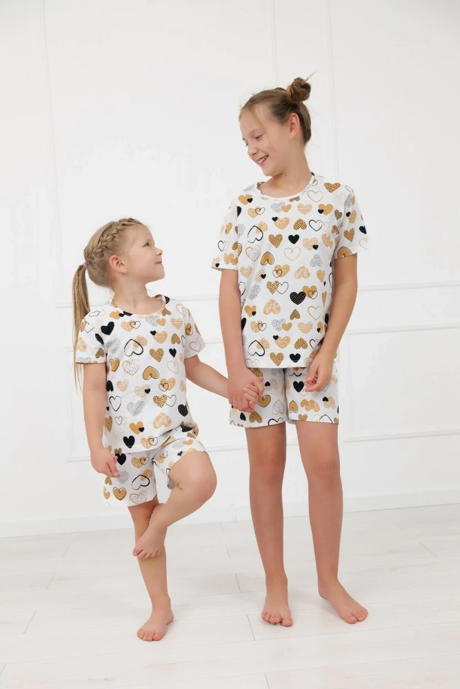 A készlet felső része egy klasszikus póló, kerek nyakkivágással. Egyszerű, laza szabás a korlátlan mozgásért és az egész éjszakai kényelemért. A póló jól illeszkedik a gyermek alakjához, és jól működik egy otthoni ruházat részeként is. A pizsamanadrágok rövidnadrágok, alagútban elhelyezett puha, rugalmas derékpánttal, amely nem nyom, és alkalmazkodik a gyermek alakjához, így intenzív mozgás közben is garantálja a kényelmet.