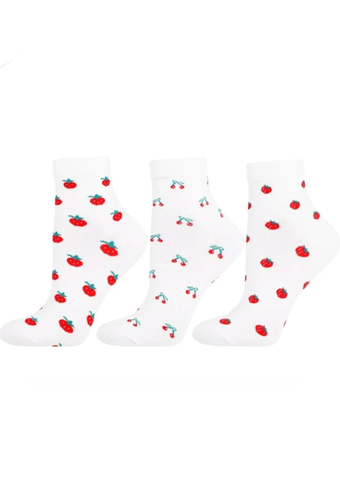 A fehér színnek köszönhetően a zokni könnyen illeszthető edzőcipőhöz, tornacipőhöz vagy sportcipőhöz. Gyümölcsminták: eper, málna vagy cseresznye, könnyed és lányos jelleget kölcsönöznek az összképnek. A minta véletlenszerűen kerül elküldésre. Modell azoknak a nőknek, akik értékelik a kényelmet, a természetes anyagokat és az apró, stílusos részleteket a mindennapi ruhatárukban.