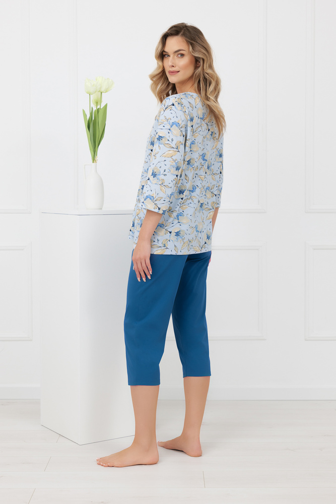 A készlet felső része egy 3/4 ujjú, gombos blúz, V-alakú nyakkivágással, amely optikailag karcsúsítja a sziluett felső részét, és biztosítja a könnyű viseletet. A finom pasztellszínű virágmotívum könnyed és friss érzést kölcsönöz az általános megjelenésnek, míg a praktikus oldalzsebek növelik a kényelmet - ideális a kisebb tárgyak számára vagy egyszerűen a kényelem érdekében. Az egyszínű, 3/4-es hosszúságú nadrágot puha elasztikus szalaggal látták el az alagútban, amely nem nyomja a nyomást, és jól illeszkedik a derékhoz.