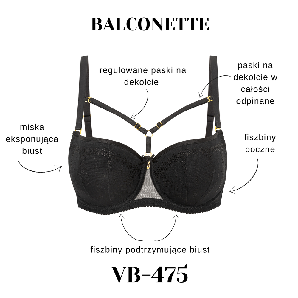 A VB-475 különlegessége a dekoltázsnál elhelyezett díszpánt-rendszer, amely állítható és teljesen levehető. Így a melltartó viselhető hangsúlyos, divatos kiegészítőként vagy letisztult, klasszikus formában is. A hátpánt rugalmas tüllből készült, jól illeszkedik a testhez, miközben oldalsó merevítők gondoskodnak a stabilitásról. A pántok állíthatók és levehetők, a szabályozók és kapcsok arany színűek, ami ékszerszerű megjelenést ad.