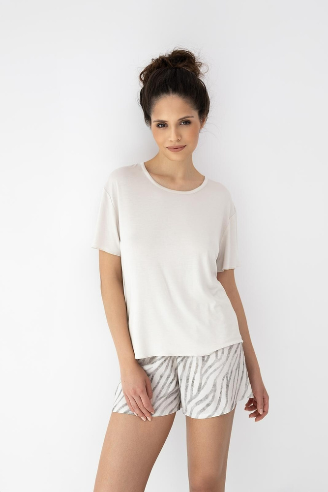 - Könnyű női pizsama légáteresztő viszkózból – egyszínű, rövid ujjú felső kerek nyakkivágással és mintás rövidnadrággal. Ideális meleg éjszakákra és otthoni pihenéshez. Válaszd a természetes, puha komfortot.