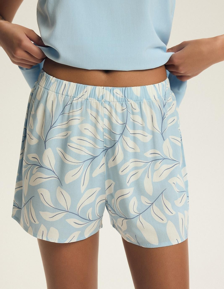 A rövid nadrág friss, növényi mintával készült, amely nyári hangulatot ad a szettnek. A rugalmas derékrész kényelmes tartást biztosít szorítás nélkül. Ez a könnyű női pizsama nemcsak alváshoz ideális, hanem otthoni viseletként is tökéletes a melegebb hónapokban. Az anyag gyorsan szárad és kis helyet foglal, így utazáshoz is praktikus.