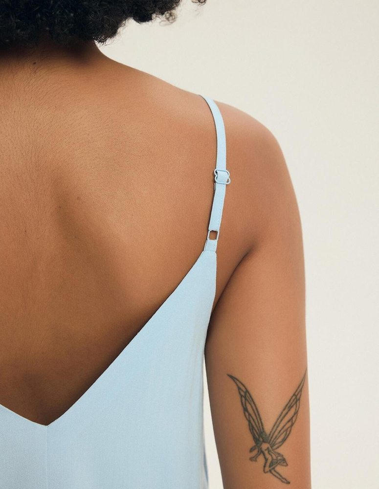 A pizsama 100% viszkózból készült – ez az anyag puha, jól szellőzik, és finoman hűs érzetet biztosít a bőrön. Az egyszínű felső V-nyakkivágással rendelkezik elöl és hátul is, amely optikailag nyújtja az alakot és nőies megjelenést kölcsönöz. A vékony, állítható pántok lehetővé teszik az egyéni beállítást testmagasság és mellforma szerint. A felsőrész belül félig bélelt, ami növeli a komfortérzetet és javítja az illeszkedést.