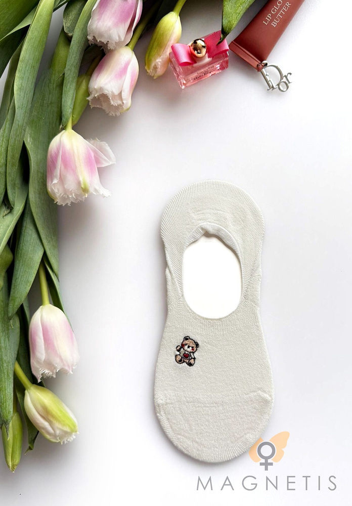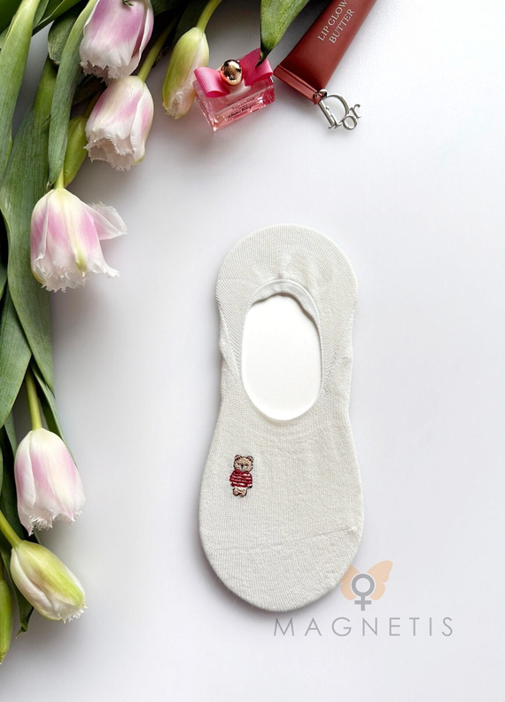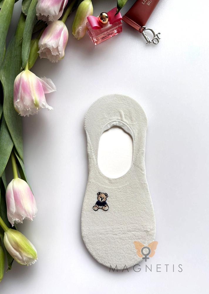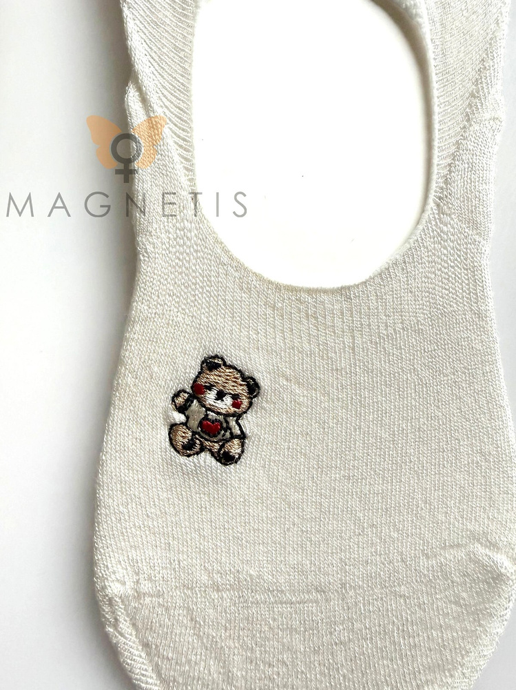 A sarok belső részén található szilikoncsík megakadályozza a lecsúszást járás közben. A hímzett mackómintás applikáció finom, játékos részletet ad a modellnek. A fehér vagy fekete szín véletlenszerűen kerül kiválasztásra a készlettől függően.