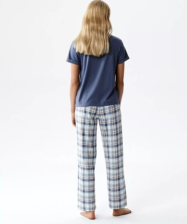 Az alsó rész mintás nadrág kényelmes szabással, amely biztosítja a mozgásszabadságot alvás közben. A csípőnél praktikus zsebek találhatók, amelyek még funkcionálisabbá teszik a pizsamát. A rugalmas derékrész kellemes illeszkedést biztosít.