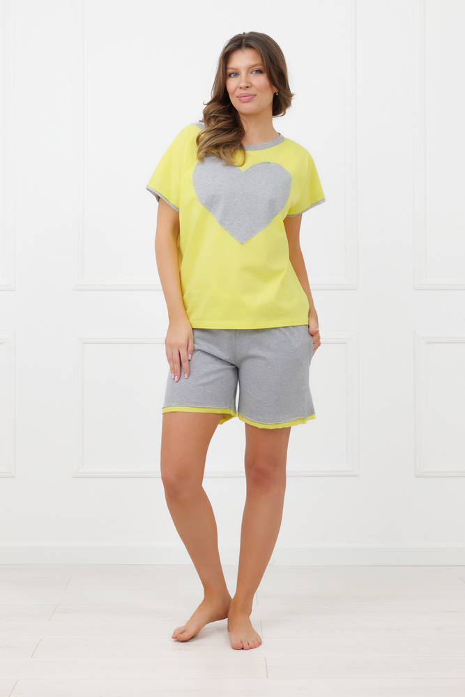 A felső rész laza szabású pólóból és csónaknyakú kivágásból áll, amely finoman lecsúsztatható az egyik vállra. Ez a részlet könnyed és nőies megjelenést kölcsönöz a modellnek. Az elülső részen kontrasztos szív alakú applikáció található, amely romantikus hangulatot ad a pizsamának és dekoratív fókuszpontként szolgál. Az ujjak a szív színével harmonizáló díszszegéllyel készültek, ami egységes és esztétikus megjelenést biztosít.
