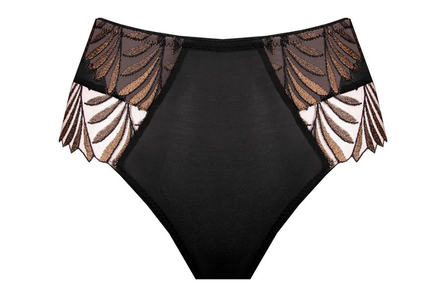 A bugyi elülső része áttetsző tüllből készült, finom dekoratív hímzéssel, amely elegáns mintát alkot, és könnyed, nőies hatást kölcsönöz a modellnek. A fekete szín klasszikus és időtálló, így könnyen kombinálható más fehérneműkkel is.