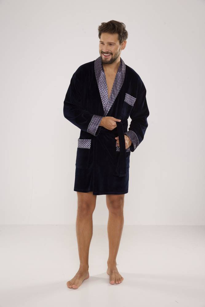 Férfi rövid bársony köpeny, sálgallérral, derékban megkötve, két foltos zsebbel és egy kisebb zsebbel a mellkas magasságában. Mintás szaténból készült mandzsetták, gallér és zsebek. 80% pamutból készült, kellemes tapintású, tökéletes vízfelvételű.