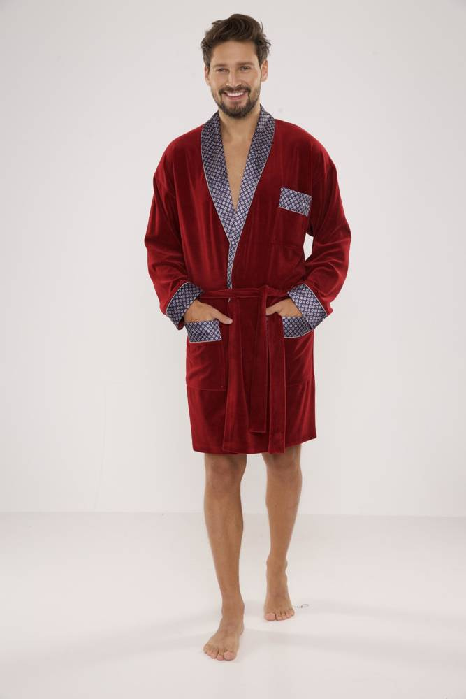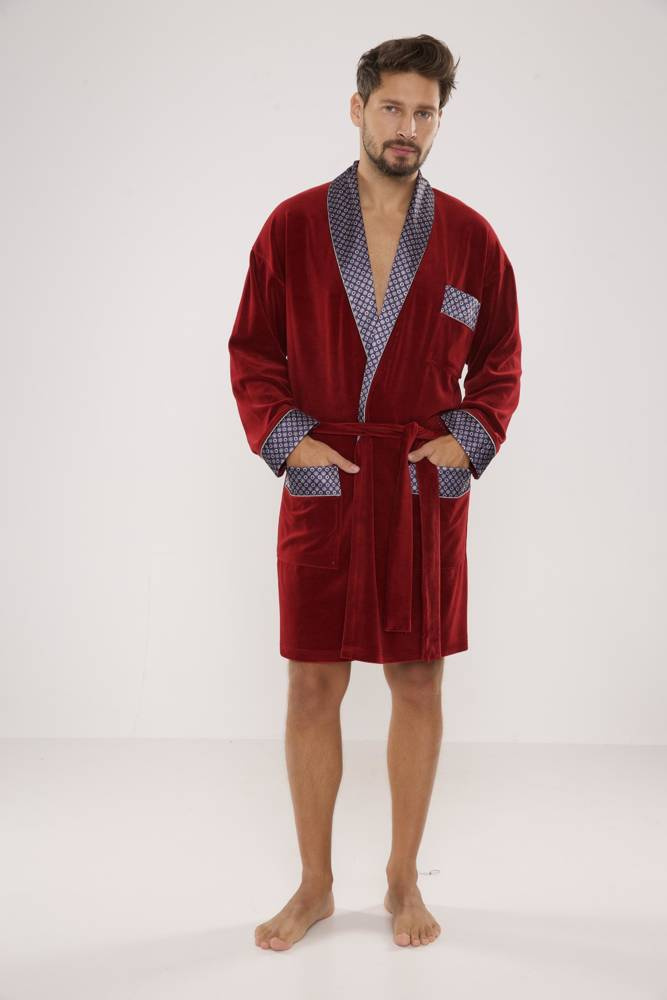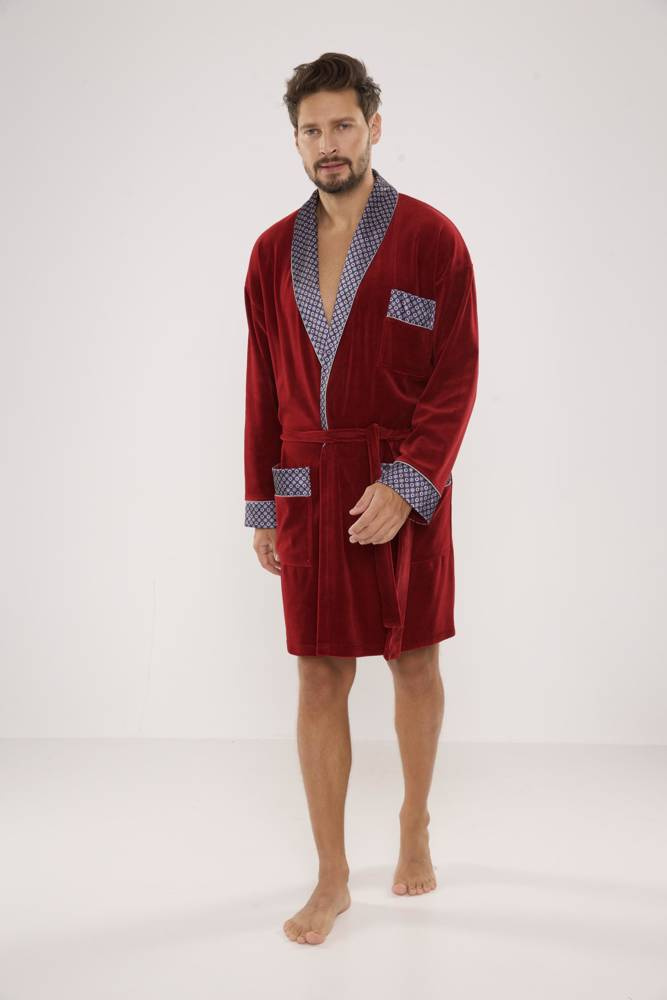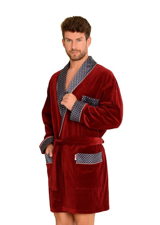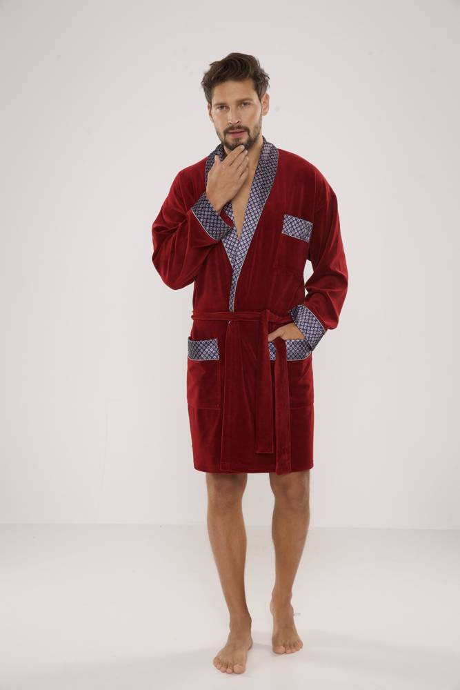 Férfi rövid bársony köpeny, sálgallérral, derékban megkötve, két foltos zsebbel és egy kisebb zsebbel a mellkas magasságában. Mintás szaténból készült mandzsetták, gallér és zsebek. 80% pamutból készült, kellemes tapintású, tökéletes vízfelvételű.
