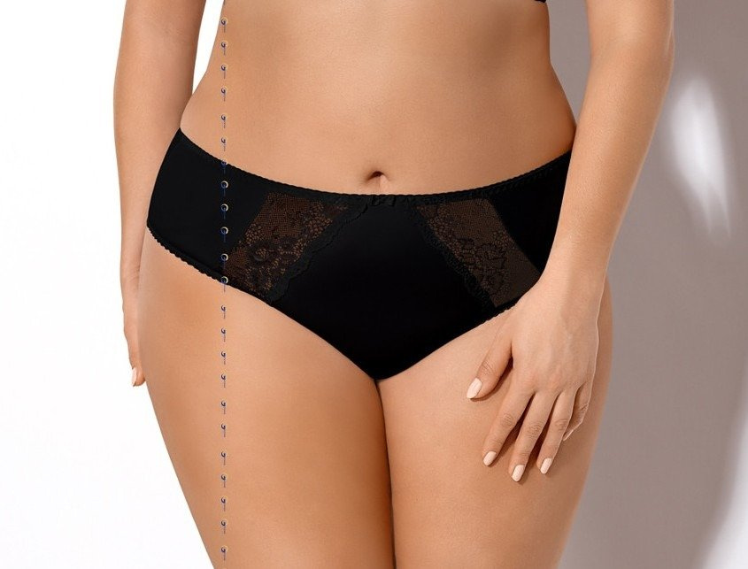 Klasszikus női bugyi, csípőn kissé felhajtva. Finom mikroszálas anyagból készült. Elöl virágos csipkebetétekkel díszítve.