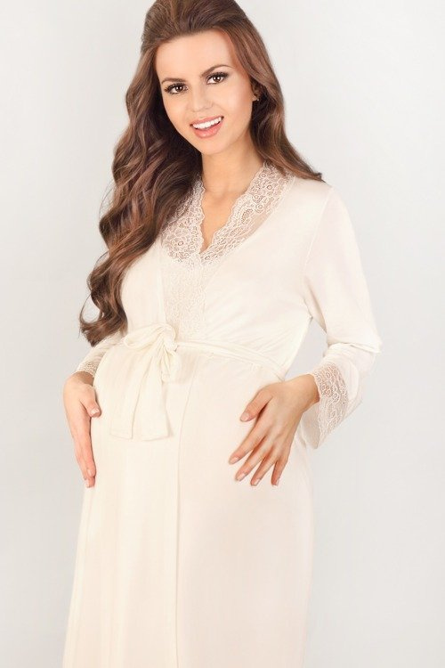 Minden leendő anyuka számára kötelező, különösen a kórházi és az azt követő időszakra, amikor a babáról gondoskodik. Használható köpenyként vagy kórházi takaróként. Puha, kiváló minőségű anyag, világos, finom színekben, gyönyörűen alkalmazkodik minden pocakmérethez. Nyakkivágás és mandzsetták feltűnő csipkével szegélyezve, derékban megkötve.