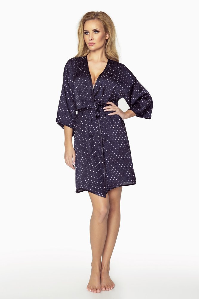Női rövid köntös, derékban megkötve. Pöttyös szaténból készült. Modell meleg nyári napokra vagy forró téli éjszakákra. Lágyan körbeöleli a női alakot a maximális kényelem és szabadság érdekében. Csak combmagasságig fedi a testet. Mater szövet nem színeződik vagy deformálódik mosás után. A fürdőköpeny egy gyönyörű, kétrészes dobozba van csomagolva, így ha ajándékot keres a másik felének, ez a tökéletes választás az Ön számára.