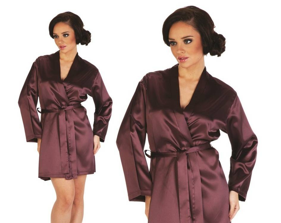Egyszerű, rövid szatén fürdőköpeny lenyűgöz eleganciájával és szinte sokoldalú felhasználásával.