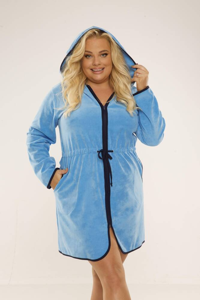 Női rövid köpeny kapucnival, cipzárral zárható. Bársonyból készült. Állítható pántok a deréknál. A fürdőköpeny tökéletesen alkalmazkodik a test alakjához, rendkívül puha és könnyű. Fürdés után öröm beleburkolózni!