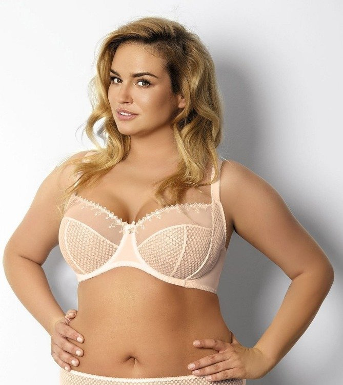 Puha merevített melltartó. Finom pöttyös csipkéből készült csészék, a felső hálós vonal feltűnő hímzéssel díszített. Függőleges bálnacsontokkal megerősített oldalak, nem levehető vállpántok.