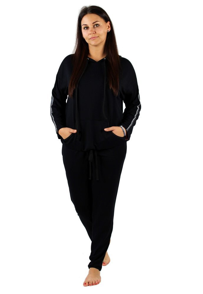 Kényelmes női tréningruha testbarát anyagból. Hosszú ujjú kapucnis pulóver. Hasi szinten, zseb. Zsebes nadrág. Húzózsinórral végződő öv. Levéllel díszített ujjak és lábak.
