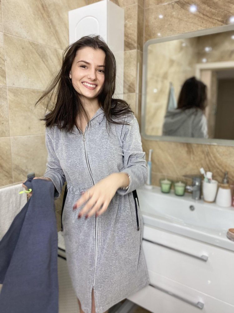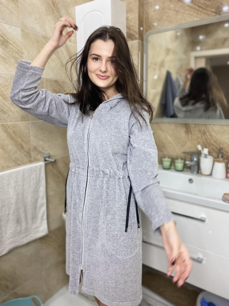 Női fürdőköpeny kellemes bársonyból, kapucnival. Cipzáras, hosszú ujjú, kényelmes zsebek csípő magasságban. Oldalán fekete nyakkendők, amelyek hangsúlyozzák a derékvonalat. A fürdőköpeny tökéletesen alkalmazkodik a test alakjához, rendkívül puha és könnyű. Fürdés után öröm beleburkolózni!