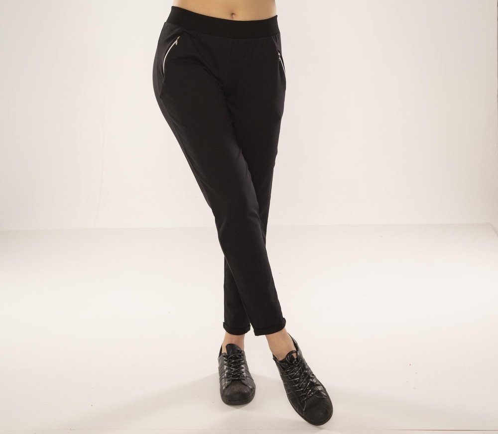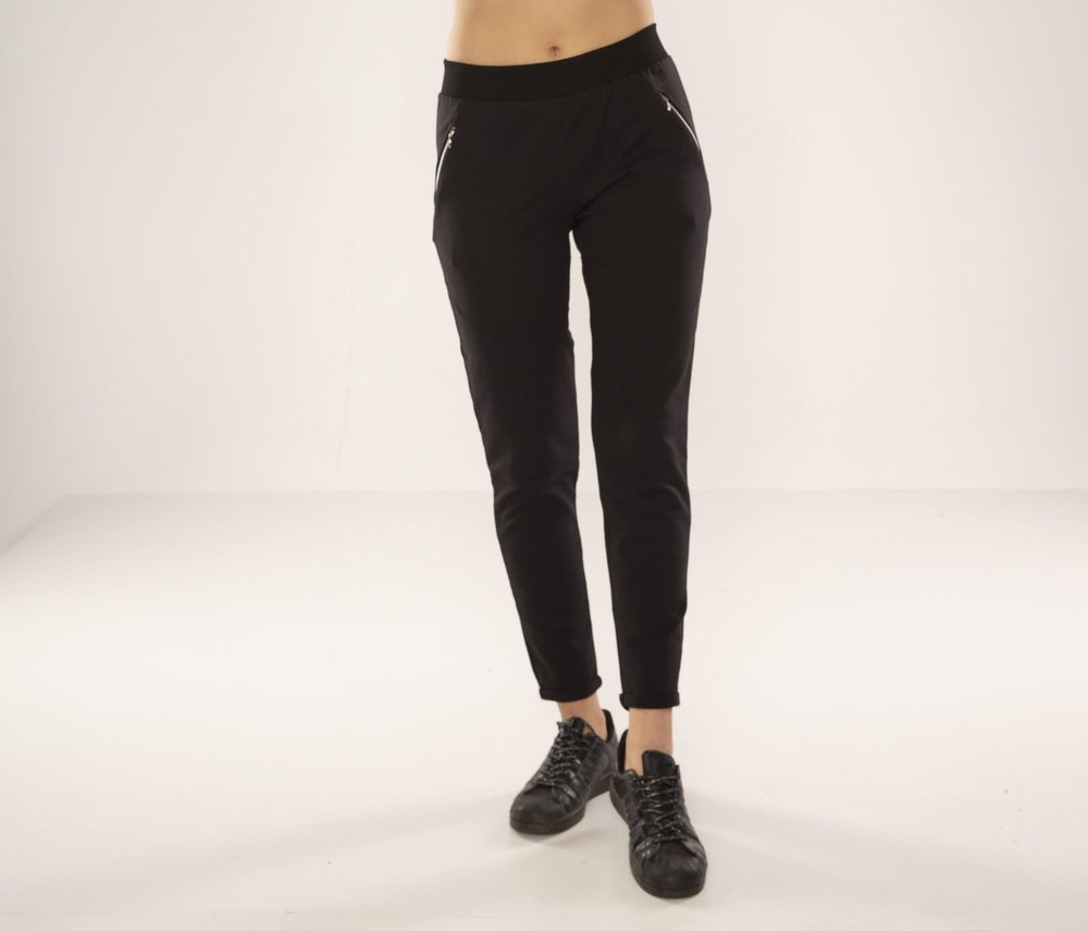 Kiváló minőségű pamutból készült melegítőnadrág. Kényelmes húzózsinór derékrész. Cipzáras zsebek csípőmagasságban. A lábak enyhén kúposak, kis mandzsettával végződnek.