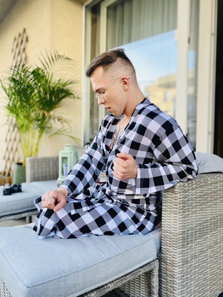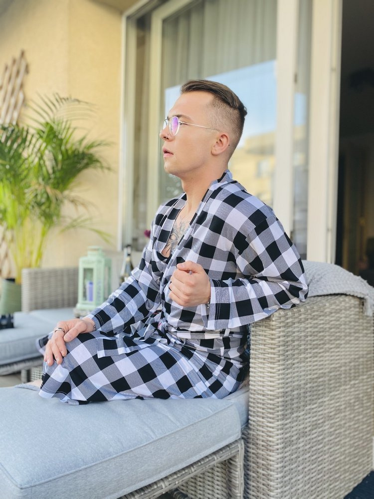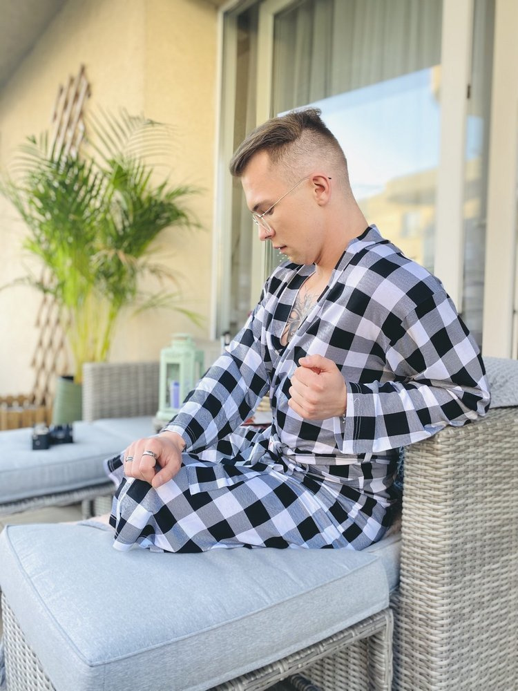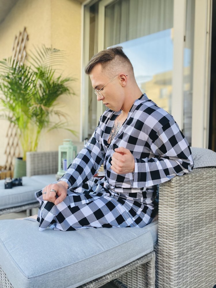 Puha viszkózból készült vékony és kellemes tapintású fürdőköpeny. A fürdőköpeny derékban van megkötve, két oldalsó zsebbel és gallérral rendelkezik. Mindent kockás, ami különleges bájt kölcsönöz neki. Ellenálló modell dörzsölés és kiváló védelmet nyújt a hideg ellen.