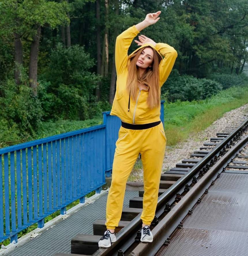 Kényelmes női tréningruha testbarát anyagból. Hosszú ujjú kapucnis pulóver. Nagy zseb az elején.