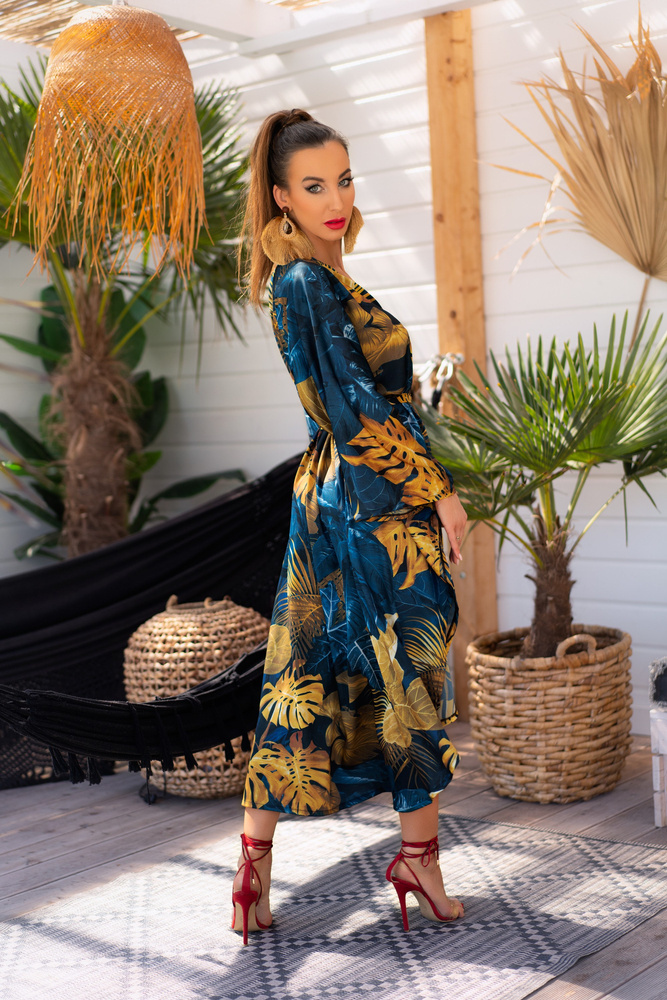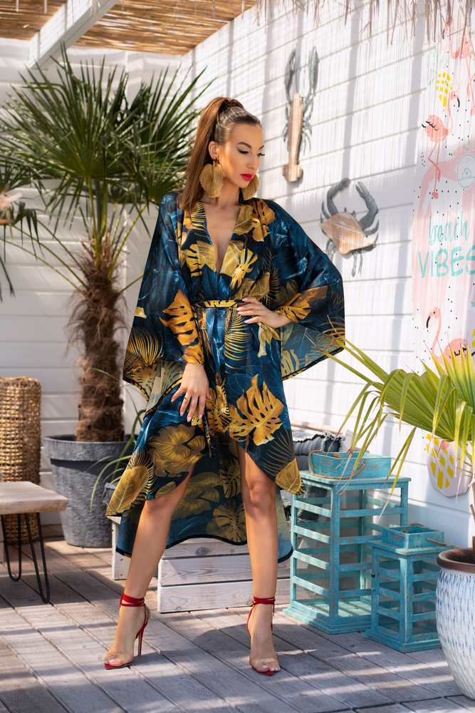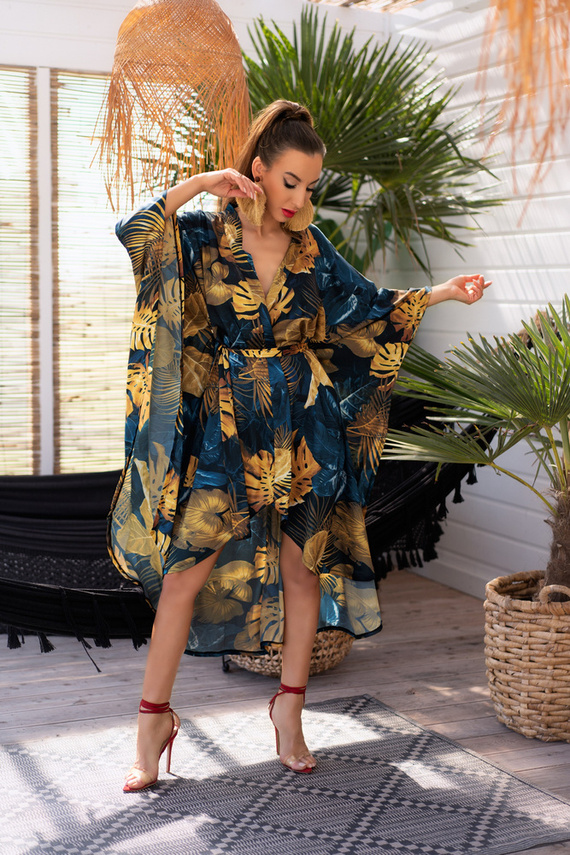 A finom érzékiség és a stílusos eredetiség ötvözése. A derékban vastag szíjjal megkötött, szellős anyagból készült köntös. Puha és kellemes tapintású anyag. A fekete szövetet virágmotívumokat ábrázoló eredeti minta díszíti. A szövet szélei a szövet összehajtásával és bélelésével védve vannak a pillingtől, ami elegáns befejezést eredményez. A köntös borítékos szabása megkönnyíti a nyakkivágás mélységének beállítását. Kényelmes, széles ujjak nem korlátozzák a mozgást, így biztosítva a kényelmet és a szabad használatot. A köntös minden testtípuson tökéletesen néz ki. Úgy tervezték, hogy elfedje a tökéletlenségeket és felfedje a figura előnyeit.