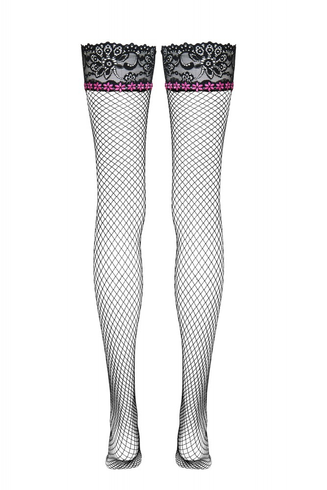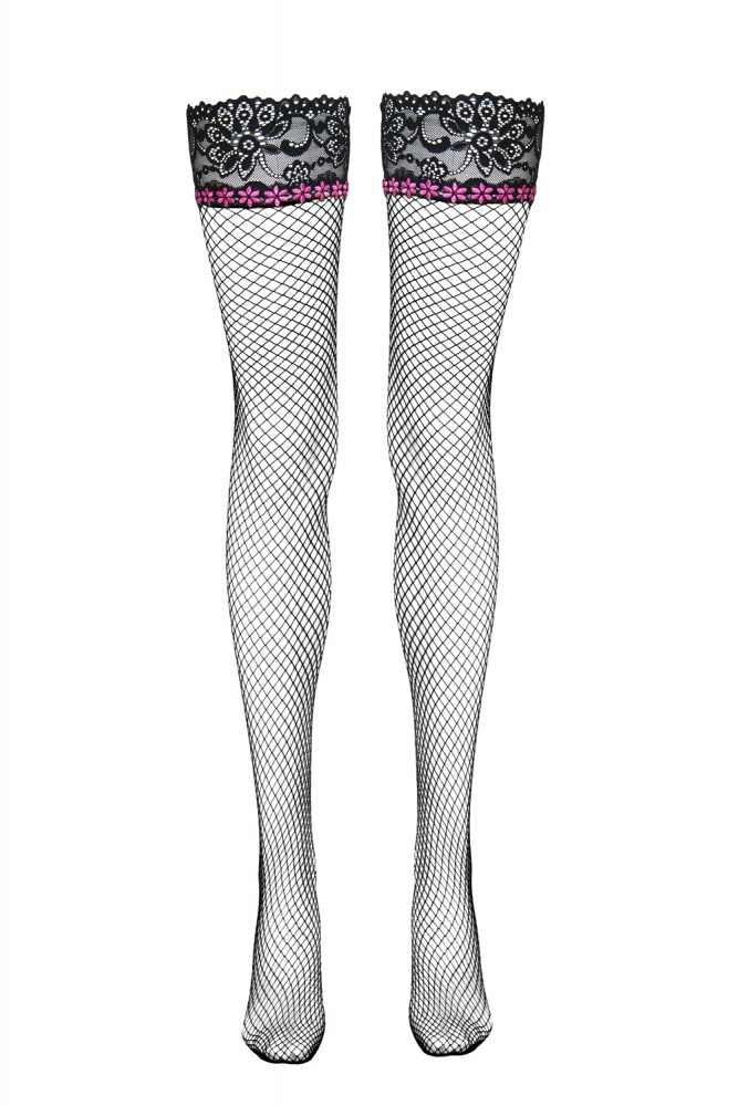 Klasszikus fekete kabaré, öves modell. A harisnya tetejét elegáns áttört csipke és rózsaszín virág applikáció díszíti.