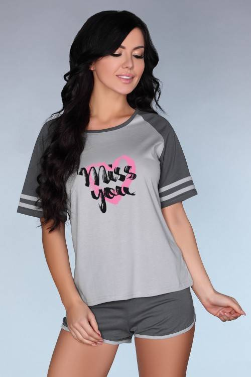 Nagyon kényelmes pamut pizsama, amely rövid sötétszürke rövidnadrágból áll, alul világosabb csíkkal szegélyezve, és hamuszínű, rövid ujjú, sötét, csíkkal díszített ingből. Ezen kívül a póló fekete feliratot tartalmaz egy rózsaszín szívre.