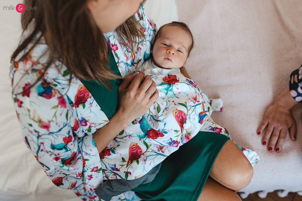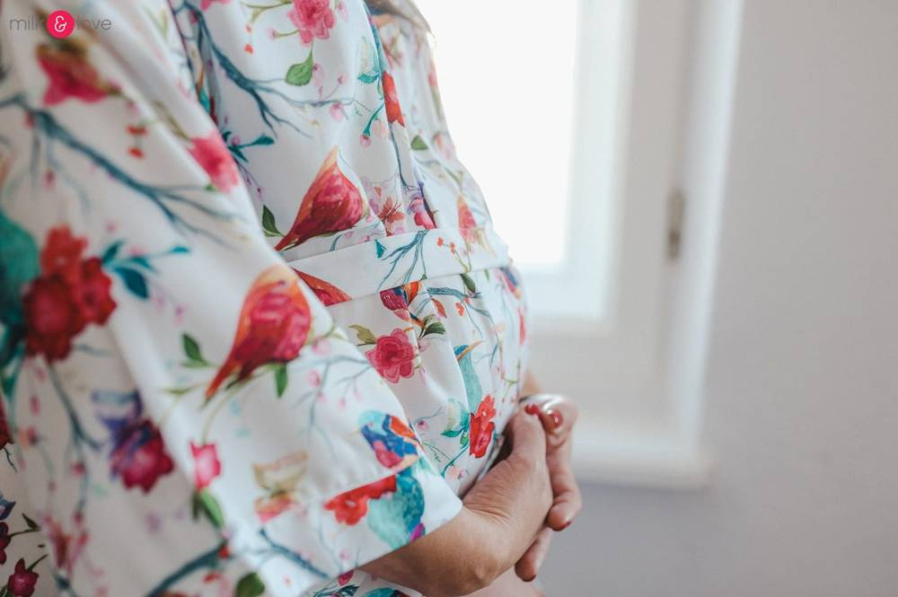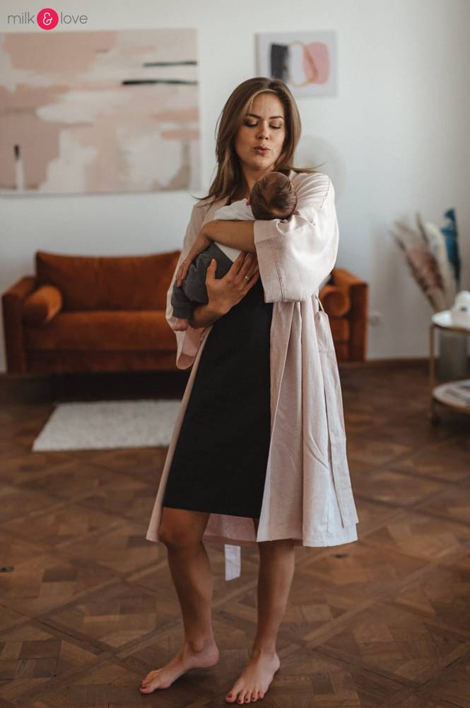 Szlafrok został zaprojektowany z myślą o mamach, dlatego jest nieco dłuższy, abyś spokojnie okryła nim ciążowy brzuszek. Po porodzie bez skrępowania b będziesz mogła spacerować po szpitalnym korytarzu lub na leżąco nakarmiła maluszka w połogu. Posiada kieszenie na niezbędne drobiazgi i pasek do regulowania szerokości.