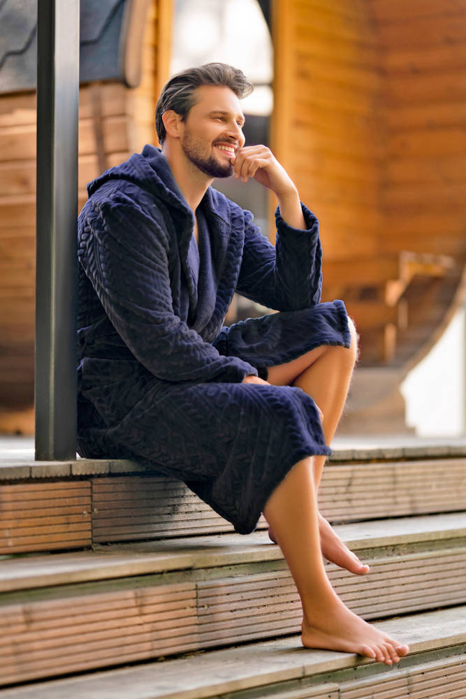 A Sigmund egy elegáns, nagyon kényelmes, meleg, puha és kellemes tapintású bi fleece kötött anyagból készült férfi köntös, dombornyomott 3D-s kockás mintával. A klasszikus vágás jól áll az alaknak. A modell nagy, kényelmes kapucnival, két praktikus zsebbel és derékszíjjal rendelkezik. Két rendkívül férfias színben kapható, tengerészkék és bordó színben.