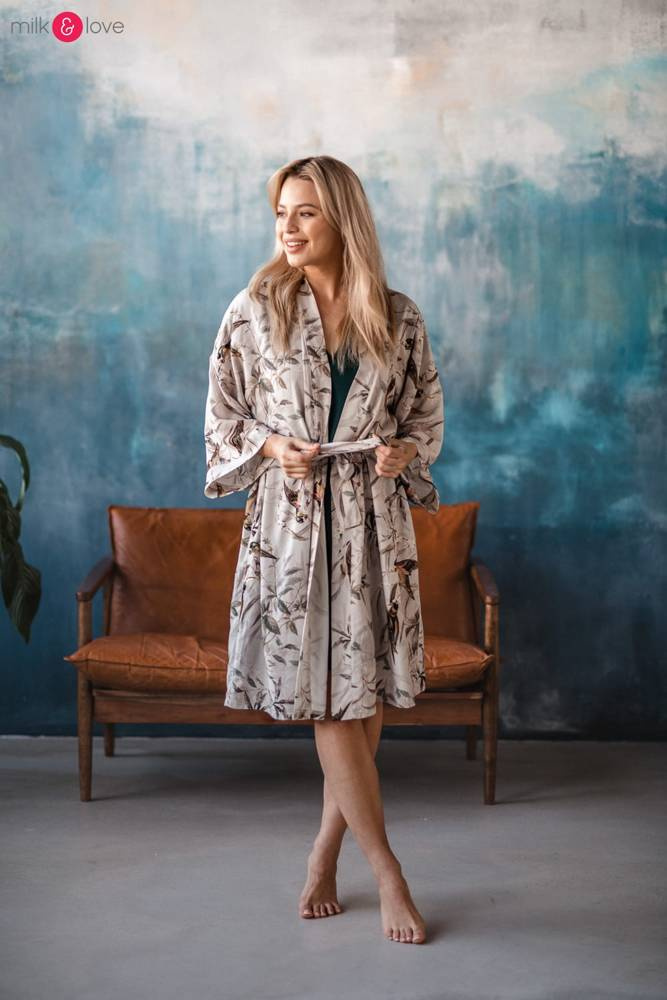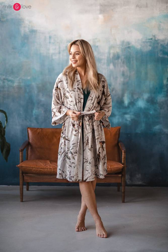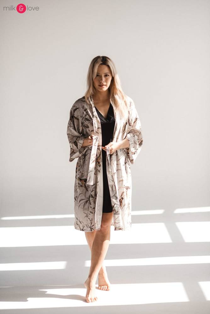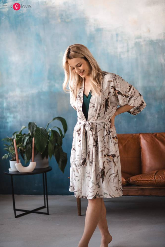 Szlafrok został zaprojektowany z myślą o mamach, dlatego jest nieco dłuższy, abyś spokojnie okryła nim ciążowy brzuszek. Po porodzie bez skrępowania b będziesz mogła spacerować po szpitalnym korytarzu lub na leżąco nakarmiła maluszka w połogu. Posiada kieszenie na niezbędne drobiazgi i pasek do regulowania szerokości.