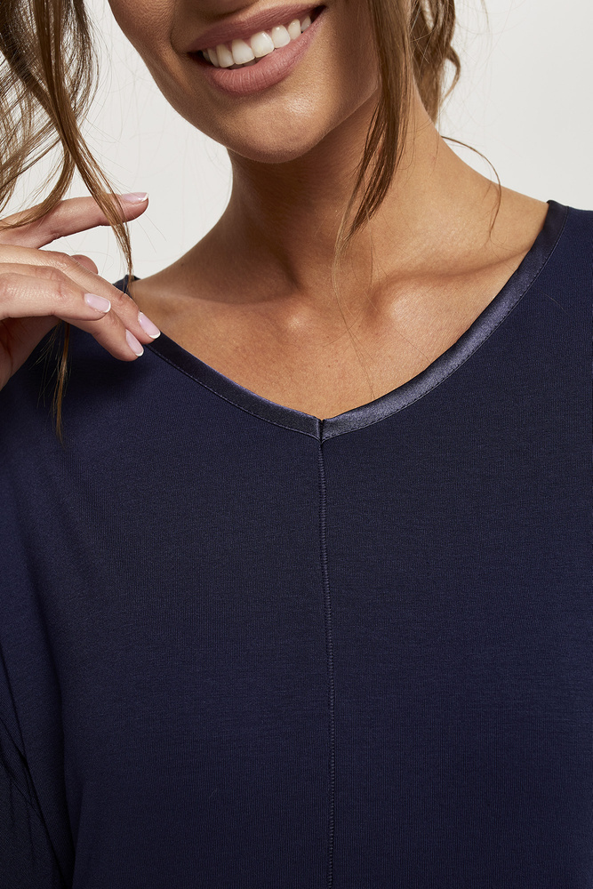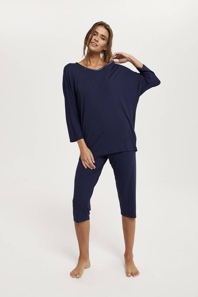 Puha női pizsama 3/4 hosszú ujjakkal és lábszárral. Elasztánnal dúsított viszkózból készült. Elérhető tengerészkék színben. A pizsamák gyönyörűen bemutatják a nő sziluettjét, kiemelve az eszközeit. A pizsama felső részét érdekes varrással látták el az eleje közepén, míg a nyakkivágást tengerészkék szatén szegéllyel fejezték be, ami elegánsabbá teszi az összképet.