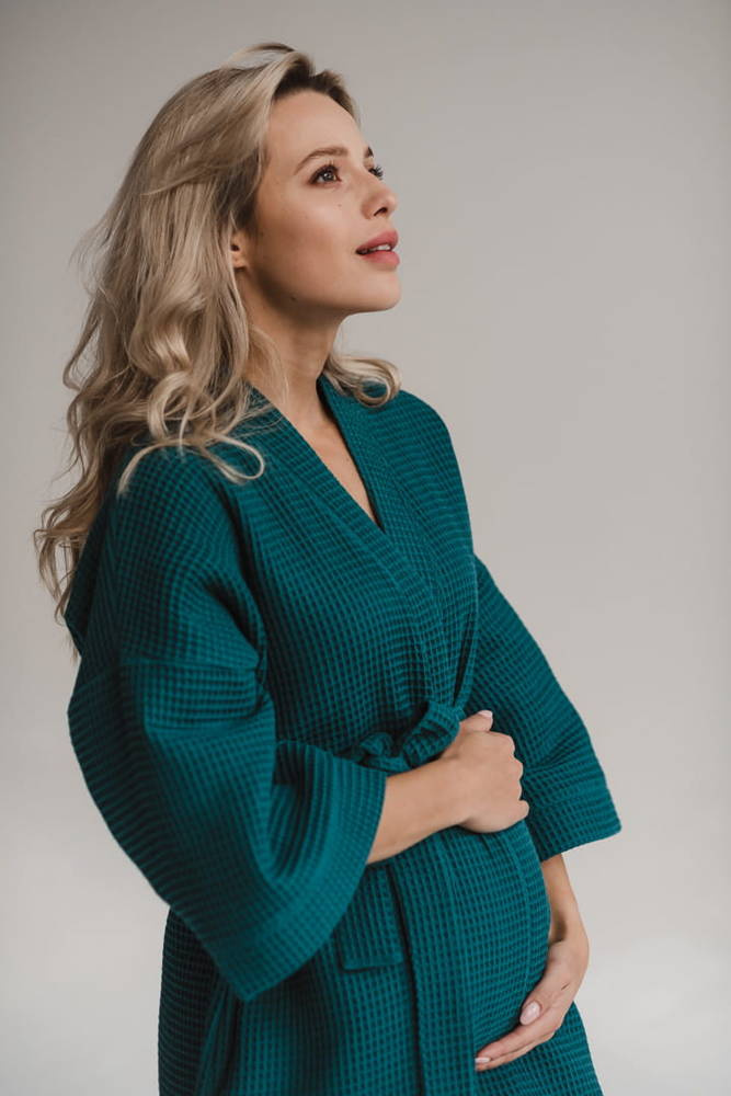 Szlafrok został zaprojektowany z myślą o mamach, dlatego jest nieco dłuższy, abyś spokojnie okryła nim ciążowy brzuszek. Po porodzie bez skrępowania b będziesz mogła spacerować po szpitalnym korytarzu lub na leżąco nakarmiła maluszka w połogu. Posiada kieszenie na niezbędne drobiazgi i pasek do regulowania szerokości.