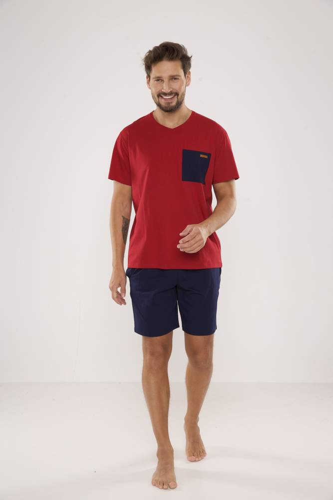 Férfi pizsama kiváló minőségű, szép és puha viszkózból készült. Klasszikus vágott modell. Rövid ujjú póló, félköríves nyakkivágással. Rövid nadrág, egyszínű, kényelmes elasztikus derékszíjjal befejezve. A legigényesebbek számára is vonzó lesz egy férfi.