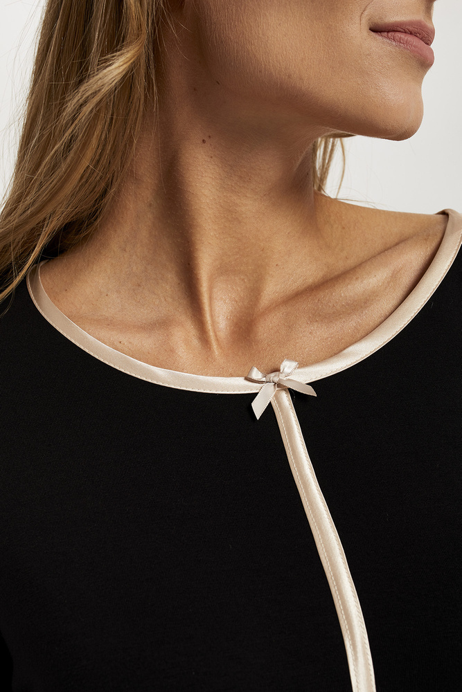 Nőies, mégis funkcionális női pizsama hosszú ujjú és hosszú nadrággal. A pizsama kerek nyakkivágással és kontrasztos szatén szalaggal rendelkezik középen. A nyaknál a blúz egy bájos masnival van befejezve. Hosszú nadrággal kiegészítve, alul elasztikus gumival befejezve. Az elasztánnal dúsított viszkóznak köszönhetően ezek a pizsamák ideálisak a hűvösebb estékre.