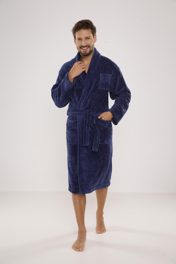 Elegáns, nagyon kényelmes, férfi fürdőköpeny. Meleg, puha és kellemes tapintású plüss kötött anyagból készült. A klasszikus vágás jól áll az alaknak. A modell két praktikus zsebbel és derékszíjjal rendelkezik.
