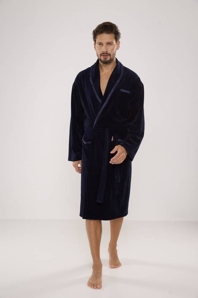 Férfi hosszú velúr fürdőköpeny. Kendőgalléros modell, derékban megkötve, két foltos zsebbel az oldalán és egy mellkason. W80% pamut bársonyból készült. Material kellemes puha tapintású és kiváló vízfelvételű.