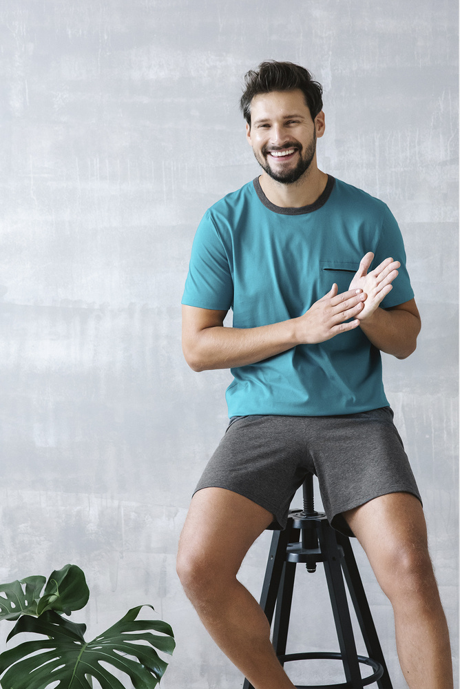 Rendkívül kellemes a bőrön a magas komfortot biztosító pamut kötöttáru használatának köszönhetően. A klasszikus vágás nagyon kényelmes lesz minden férfi számára. A tengerészkék felső és a mintás rövidnadrág gyönyörű, klasszikus szettet alkot.