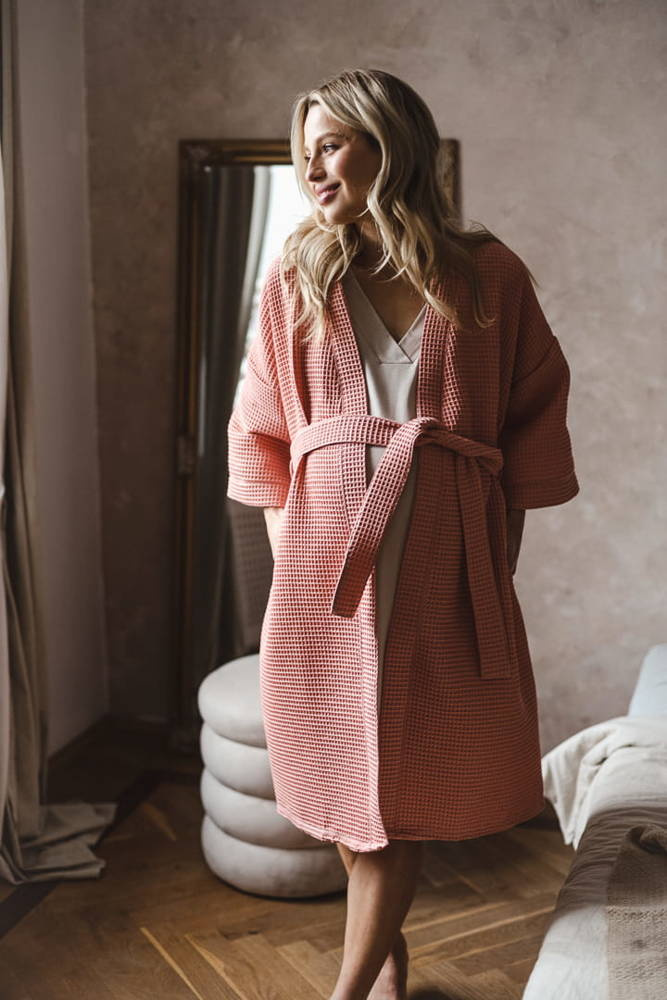Szlafrok został zaprojektowany z myślą o mamach, dlatego jest nieco dłuższy, abyś spokojnie okryła nim ciążowy brzuszek. Po porodzie bez skrępowania b będziesz mogła spacerować po szpitalnym korytarzu lub na leżąco nakarmiła maluszka w połogu. Posiada kieszenie na niezbędne drobiazgi i pasek do regulowania szerokości.