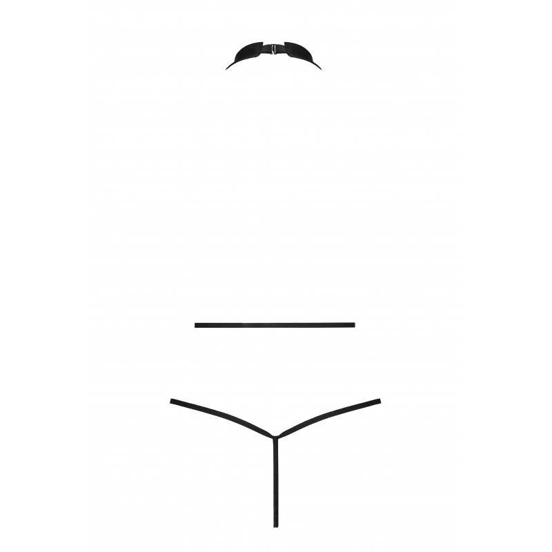Eredeti, nyakba akasztható bodysuit fekete bőrből készült, dekoratív kör alakú láncszemekkel és a testre tapadó pántokkal.