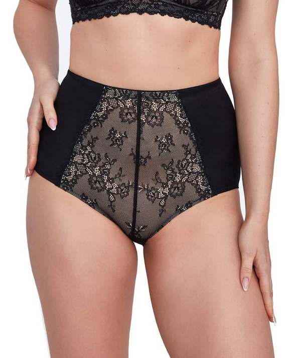 Női bugyi magas derékvonallal. Áttört csipkéből készült, kiegészítő anyaggal bélelt