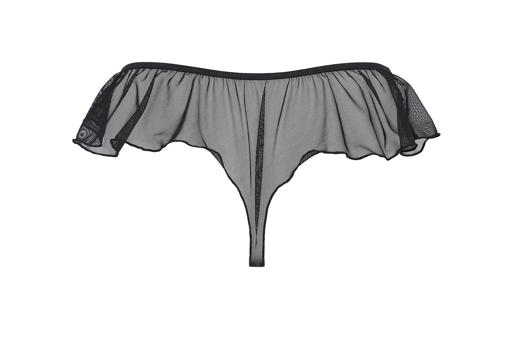 Női tanga fodros szegéllyel és szemet gyönyörködtető hímzéssel díszítve.